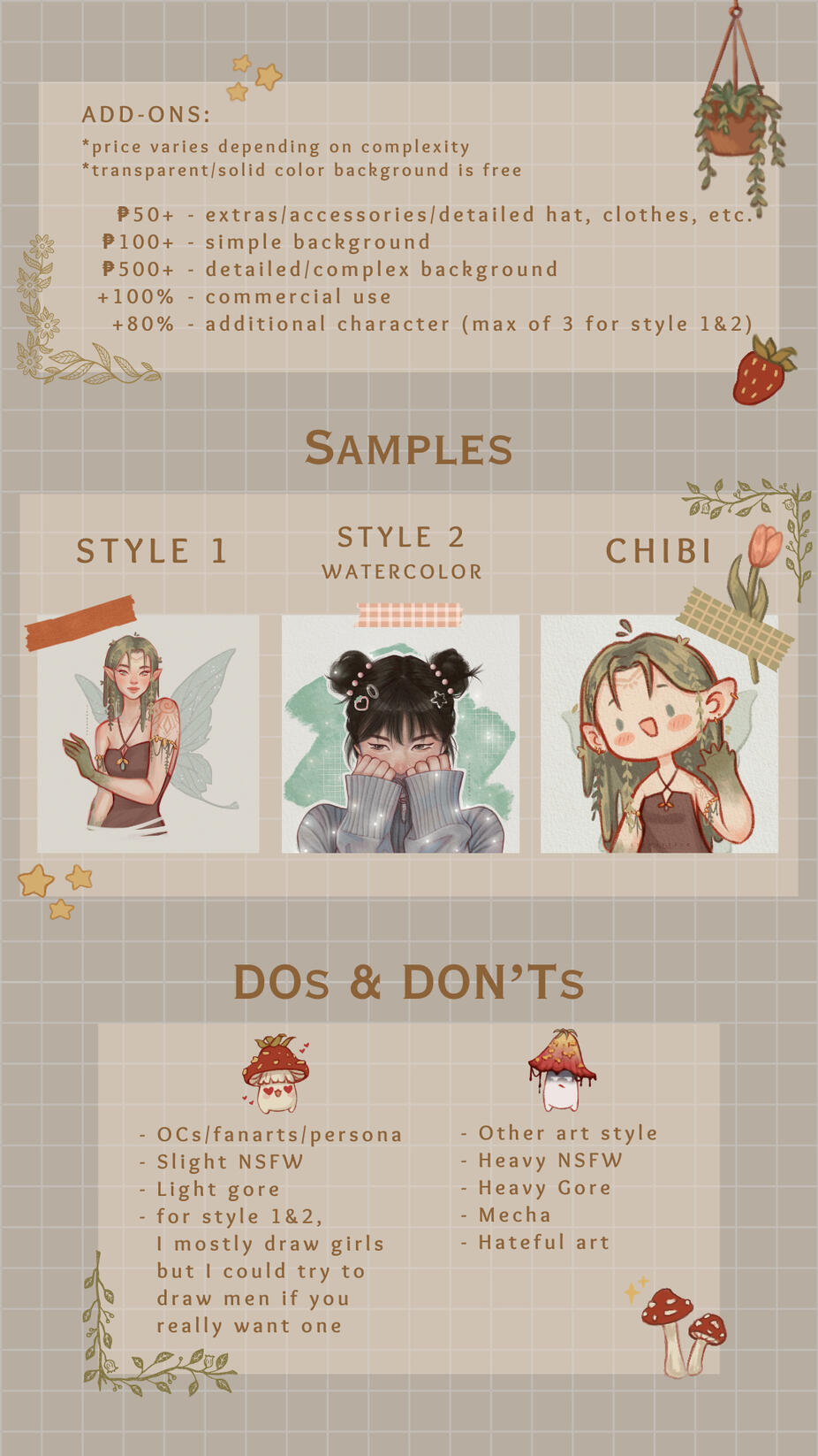 🍄 1. READ MY TERMS OF SERVICE🌱 Please read my full terms of service before sending your request form. I hope you read through everything and confirm we do not have conflict of interest!🍄 2. SEND ME A REQUEST🌱 Fill up the request form with complete details. This form will only be available if I have my comms open.🍄 3. WAIT FOR MY CONFIRMATION🌱 Please wait as I review your request and confirm that I am able to commit to it.🍄 4. PAYMENT SETTLEMENT🌱 Once I confirm your request, I will send you the payment details. This will also serve as a record of our transaction.