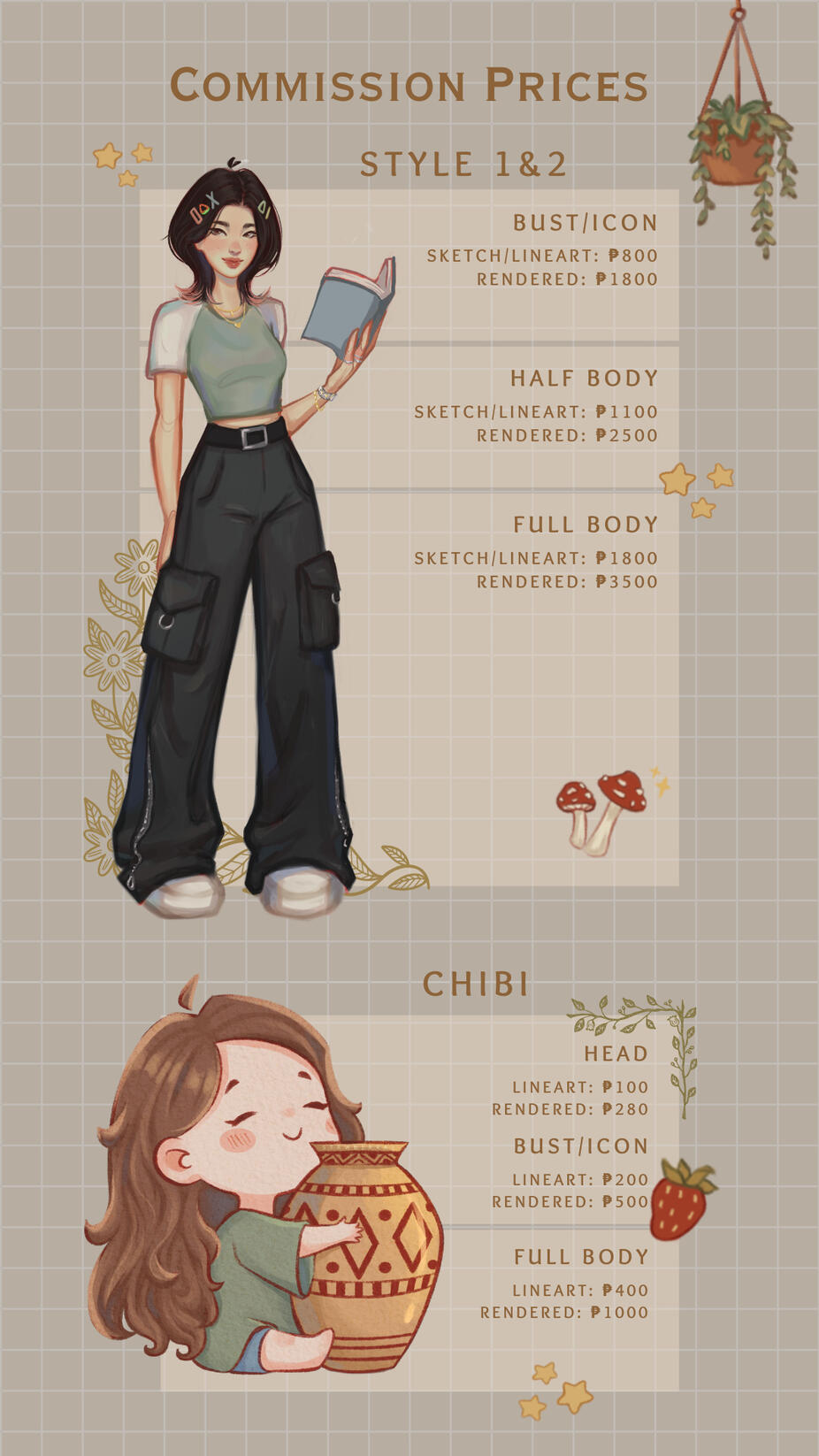🌱 Full payment must be settled to proceed after sketch.🍄 5. QUEUING🌱 Once we've settled payment, I'll put you in my queue. Depending on the amount of work I'm currently dealing with, I may or may not be able to immediately work on your slot.🍄 6. SKETCH APPROVAL AND UPDATES🌱 When your slot comes up, updates are to be shown in a notion board which I will provide the link for once we've settled with a sketch. You're free to message me if you have further questions about the update.🍄 7. FINAL APPROVAL AND DELIVERY🌱 I will be messaging you once again, for you to approve the final render. Once we agree on it, I'll send you a GDrive link containing the final illustration in JPEG and PNG format.